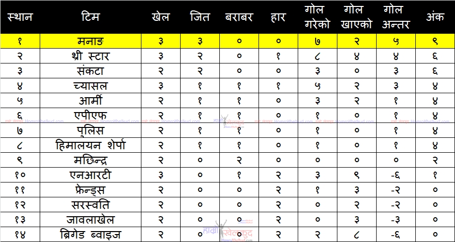 काठमाडौं (हाम्रो खेलकुद) – पल्सर सहिद स्मारक ए डिभिजन लिग अन्तर्गत शुक्रबार तीन खेल हुँदैछन् । बिहीबार थ्री स्टारलाई पराजित गरेसँगै मनाङले लिगको शीर्ष स्थानमा ३ अंकको अग्रता बनाएको छ ।