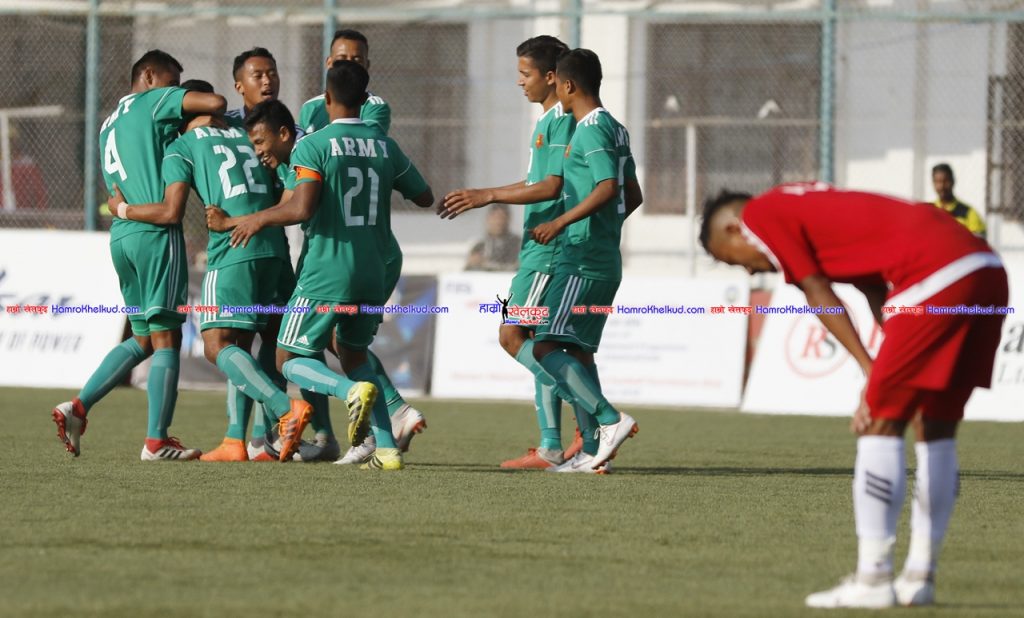 आर्मीले पहिलो हाफमा मिडफिल्डर टेकबहादुर बुढाथोकीको गोलमा अग्रता लिएको थियो । ३१ औं मिनेटमा टंक बस्नेतले दायाँ विङ्सबाट गरेको क्रसलाई पेनाल्टी क्षेत्रभित्र रहेका कप्तान भरत खवासले छाडेपछि टेकबहादुरले गोलरक्षकलाई बिट गर्दै गोल गरेका थिए ।