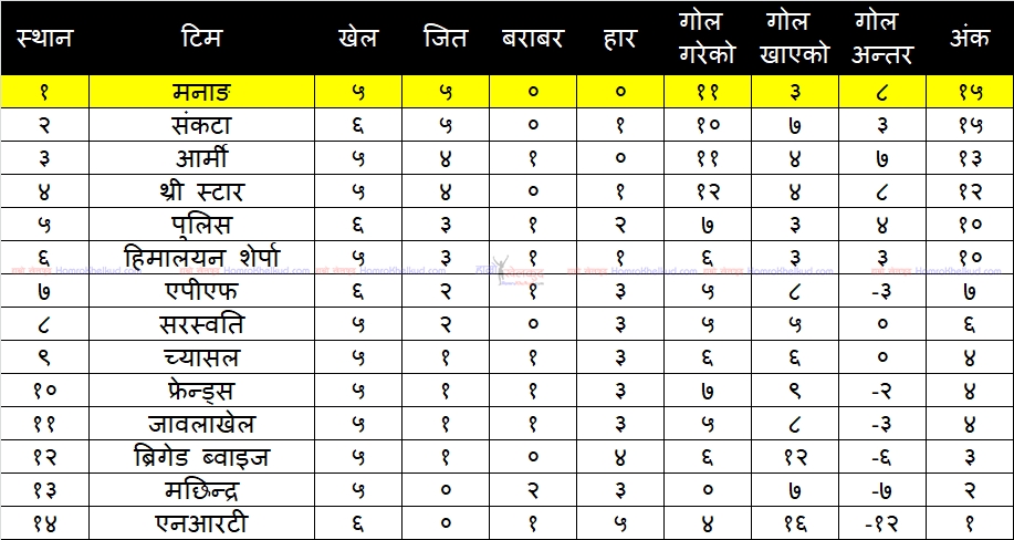 लिग तालिकाको शीर्ष स्थानमा रहेको मनाङ मर्स्याङदीले ११ बजे एन्फा कम्प्लेक्समा हुने खेलमा जावलाखेल युवा क्लबको सामना गर्नेछ । मनाङले लिगको पाँचौ चरणसम्मआइपुग्दा शत प्रतिशत जित नतिजा निकालेको छ । यता जावलाखेलले पछिल्लो खेलमा ब्रिगेड ब्वाइजलाई १-० ले पराजित गर्दै लिगमा पहिलो जित निकालेको थियो ।