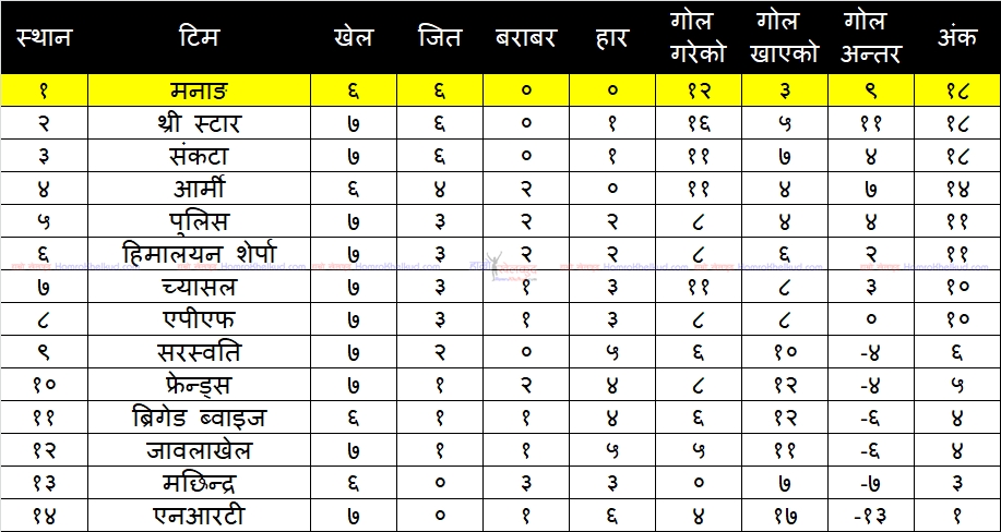 मनाङले पछिल्लो खेलमा जावलाखेललाई हराउन निकै कसरत गर्नुपर्यो । अन्जन विष्टको पेनाल्टी गोलमा मनाङ विजयी रहेको थियो । मछिन्द्रले पुलिस र च्यासलबाट अंक खोस्दै लिगमा राम्रो सुरुवात गरेको थियो । मनाङले पनि मछिन्द्रबाट बच्न सकेसम्म चाँडो गोल गर्नुपर्ने देखिन्छ । दुई विदेशी फरवार्ड उतारेको मनाङको प्रदर्शन सोचेअनुरुप हुन सकेको छैन ।