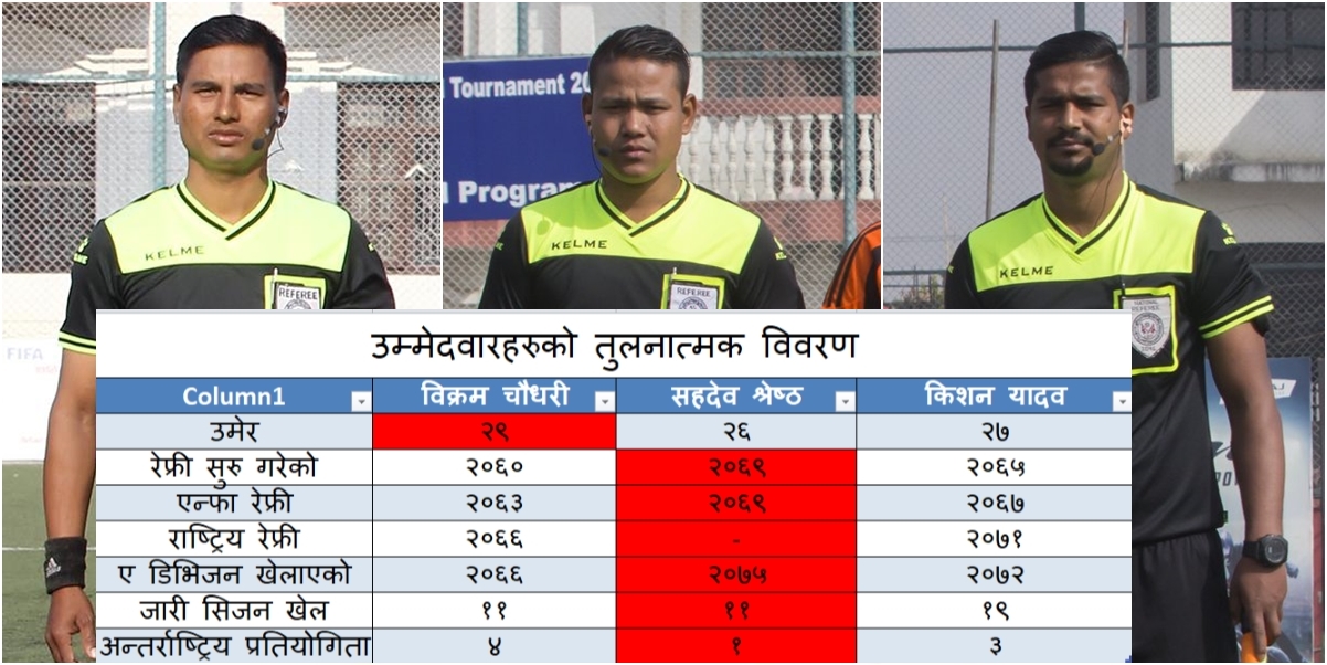 श्रेष्ठको तुलनामा दुवै किशन र विक्रम बलिया उम्मेदवार हुन् । विक्रमले डेढ दशकदेखि रेफ्री करिअर अंगालेका छन् । उनले ए डिभिजन खेलाएको एक दशक पुग्न लागिसक्यो । हालसम्म ४ अन्तर्राष्ट्रिय प्रतियोगिता खेलाएका उनले मोफसलमा पनि नियमित ठूला प्रतियोगिता खेलाउने गरेका छन् ।
