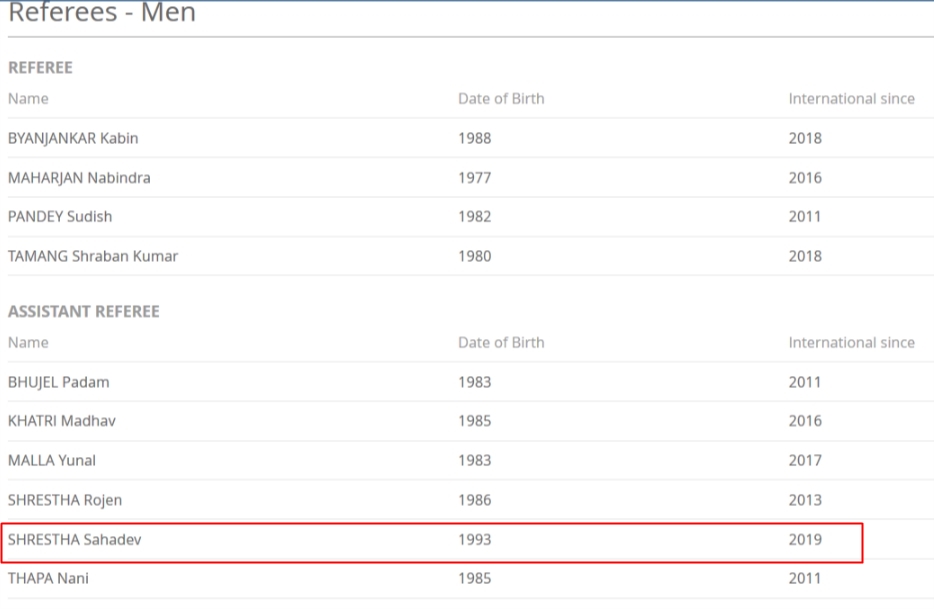 फिफा सहायक रेफ्रीका लागि दक्ष उम्मेदवार हुँदाहुँदै एन्फाले निकै कम अनुभव बोकेका र एक हिसाबले अयोग्य उम्मेदवारलाई फिफा रेफ्रीका लागि सिफारिस गरेको हो । फिफा सहायक रेफ्री प्रकाशनाथ श्रेष्ठले आफ्नो नाम फिर्ता लिन आग्रह गरेपछि फिफा सहायक रेफ्रीको स्थान रिक्त भएको थियो । सोहि स्थानमा पछिल्लो एक दशक देखि रेफ्री गरिरहेका अनुभवी र दक्ष विकल्पलाई बेवास्ता गर्दै एन्फाले एपीएफका श्रेष्ठलाई नियुक्त गरेको हो ।