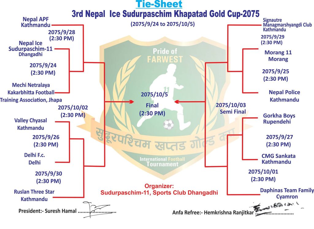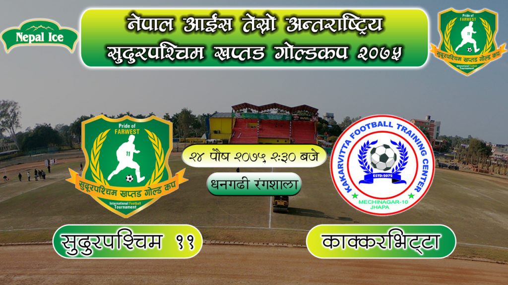 धनगढी (हाम्रो खेलकुद) – सुदुरपश्चिमको धनगढीमा मंगलबारदेखि सुरु हुने नेपाल आइस तेस्रो अन्तर्राष्ट्रिय सुदूरपश्चिम खप्तड गोल्डकपको उद्घाटन खेलमा आयोजक सुदूरपश्चिम-११ स्पोर्ट्स क्लब र काक्करभीट्टा फुटबल ट्रेनिङ सेन्टर भिड्दैछन् । खेल दिनको २:३० बजे धनगढी रंगशालामा सुरु हुनेछ ।