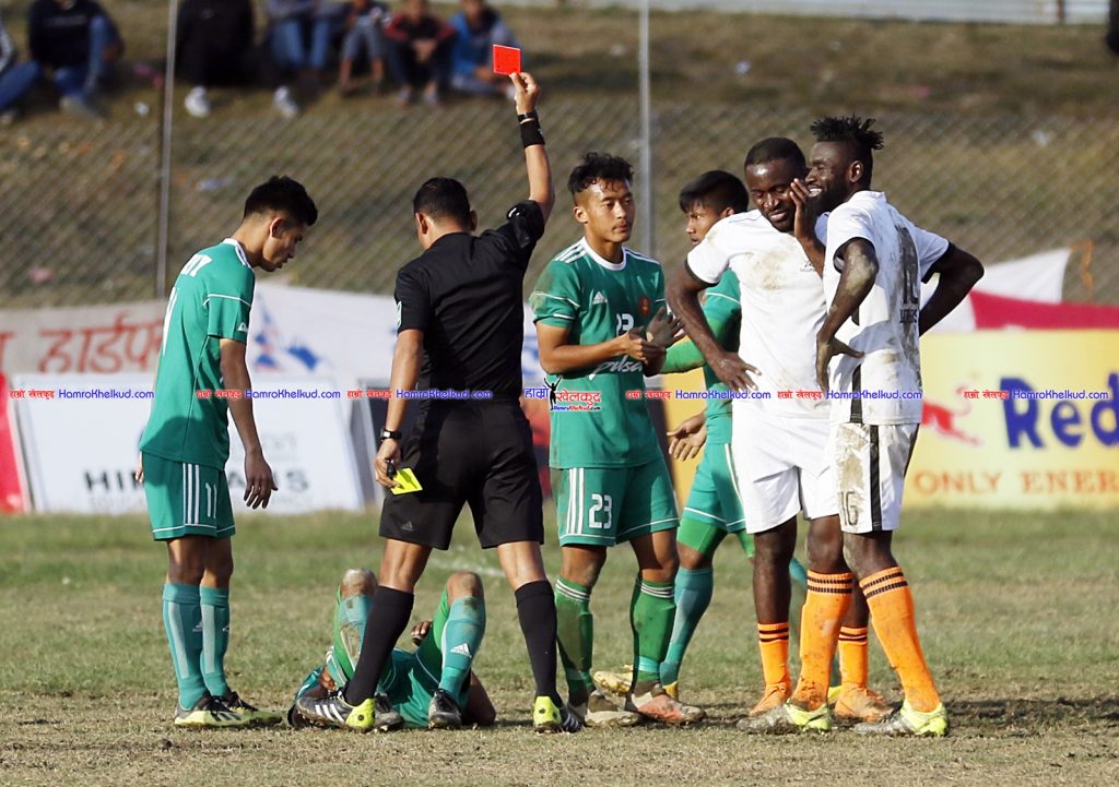 आर्मीविरुद्ध निकै प्रतिस्पर्धात्मक खेलमा रेफ्री सुदिश पाण्डेले दाउफिन्सका एक खेलाडीलाई दोहोरो पहेंलो कार्ड देखाएका थिए । खेलको अन्तिम समयमा रेफ्रीसँग विवाद गरेको भन्दै पाण्डेले कप्तान जोसेफलाई पनि पहेंलो कार्ड देखाएका थिए । यसबाहेक खेलदौरान पनि रेफ्रीको निर्णय एकपक्षीय भएको भन्दै दाउफिन्सका खेलाडी रुष्ट देखिएका थिए ।