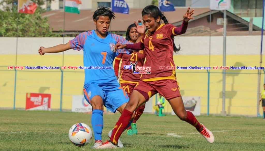 विराटनगरस्थित शहिद रंगशालामा भारतले ग्रेस दाङमेई, सन्ध्या रंगनाथन र इन्दुमति खाथिरीसानकाे गाेलबाट अग्रता बनाएकाे हाे । खेलकाे तेस्राे मिनेटमै भारतकी सन्ध्याकाे बक्सबाहिरकाे प्रहार क्रसबारमा लागेर फर्किएकाे बललाई अनमार्क रहेकी ग्रेसले सहजै गाेल गरिन् ।