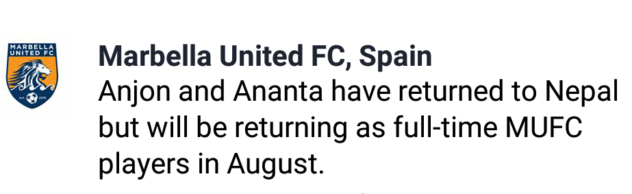 यश अघि प्रशिक्षणमा गएका अन्जन र अनन्त यसपाली फुल टाइम खेलाडिका रुपमा जाने कुरा मार्बेलाको फेसबुकमा जनाइएको छ ।