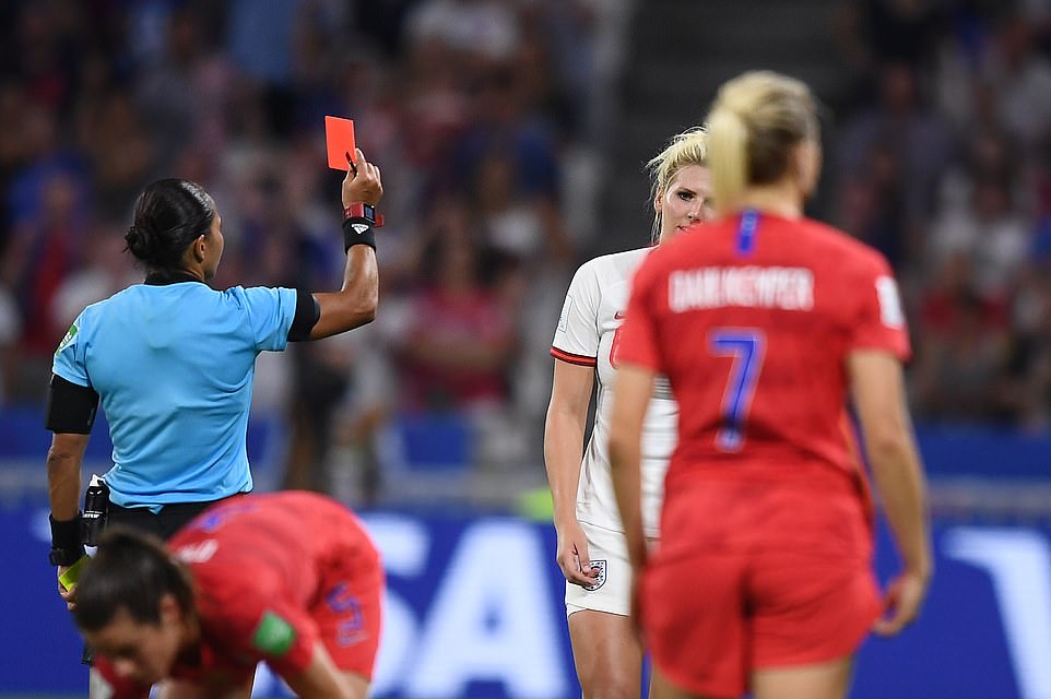 त्यसको दुई मिनेटपछि इंग्ल्यान्ड १० खेलाडीमा समेटियो । मिली ब्राइट दोहोरो रातो कार्ड खादै मैदानबाट बाहिरिएपछि इंग्ल्यान्डको खेलमा फर्कने सम्भावना सकिएको थियो ।