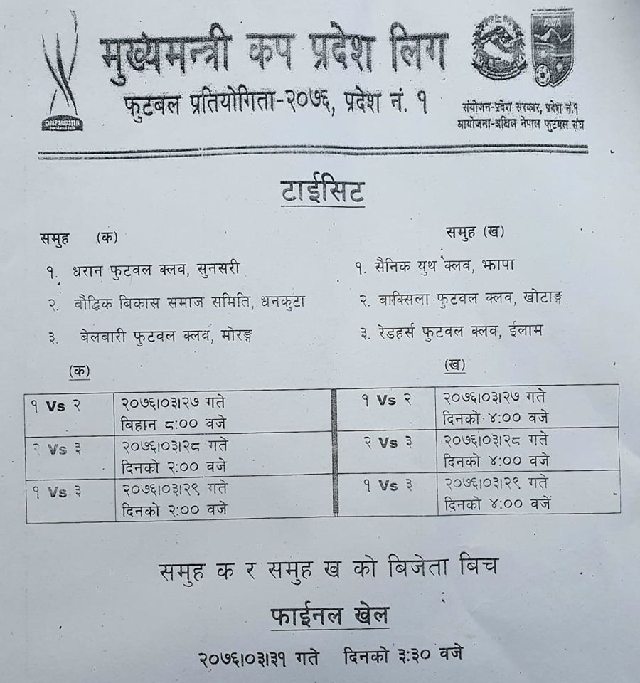 धरानको विपि कोइराला प्रतिष्ठानको फुटबल मैदानमा भएको खेलमा धरान एफसी सुनसरीले बौद्धिक विकास समाज धनकुटालाई ३–२ ले हरायो । अर्को खेलमा सैनिक युथले खोटाङको वाक्सिला एफसीलाई ६–३ ले पराजित गरेको थियो ।