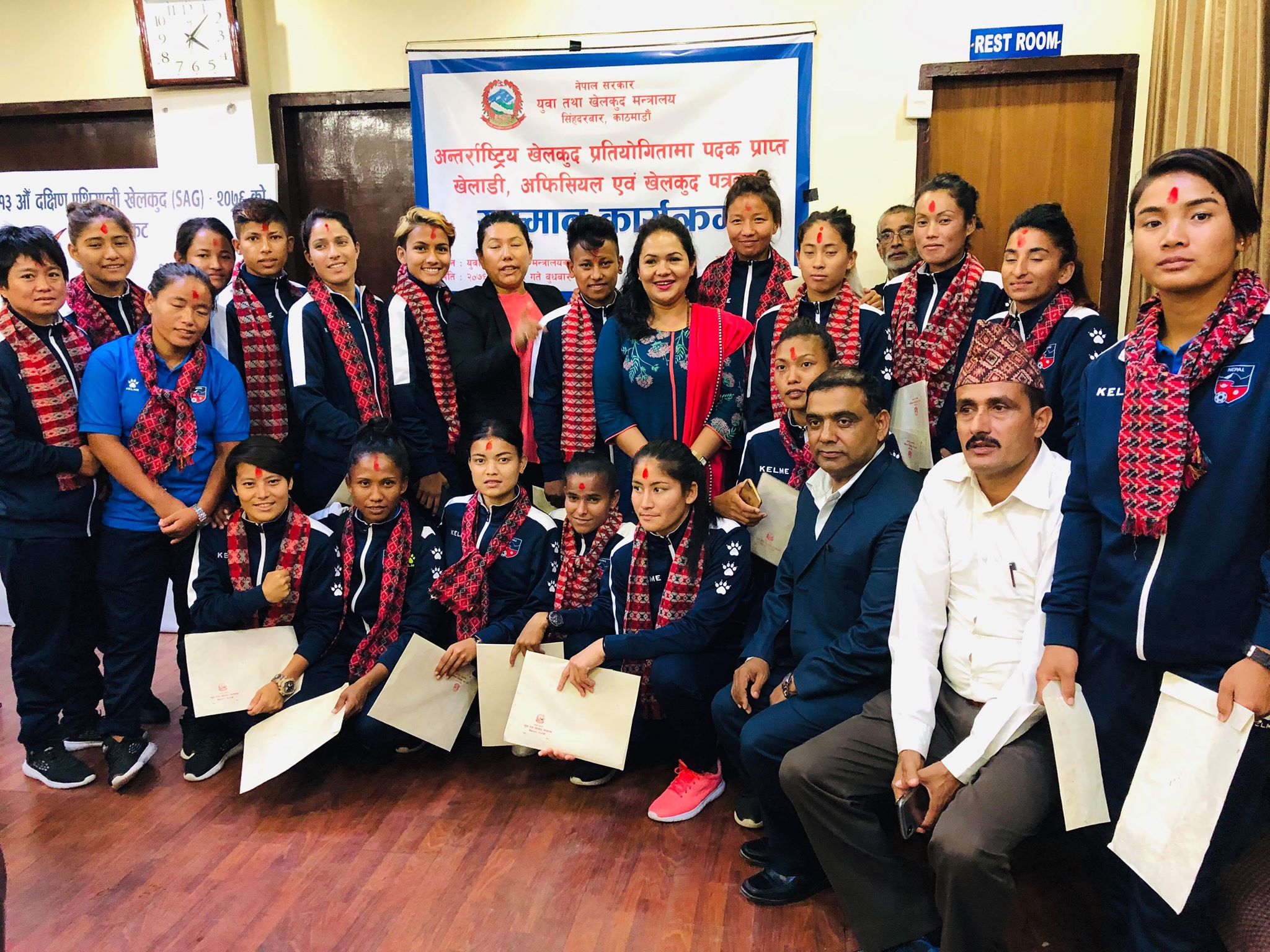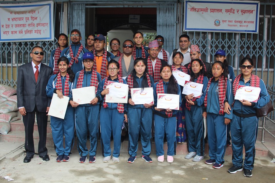 युवा तथा खेलकुद मन्त्रालय सिहंदरबारमा बुधबार आयोजित कार्यक्रममा युवा तथा खेलकुद मन्त्री जगत सुनार विश्वकर्मा, राष्ट्रिय खेलकुद परिषद्का उपाध्यक्ष पिताम्बर तिम्सिना, अखिल नेपाल फुटबल संघ (एन्फा) का अध्यक्ष कर्मा छिरिङ शेर्पालगायतले नेत्रहिन महिला क्रिकेट टोली, महिला फुटबल टोली, एथलेटिक्स, ब्याटमिन्टन, पारा खेलाडी र पत्रकार गरि ५० जनालाई नगद सहित सम्मान गरेका हुन् ।