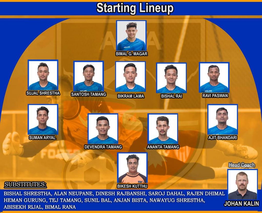 सुजल श्रेष्ठको कप्तानीमा रहेको टोलीमा गोलरक्षक विकेश कुथु रहेका छन् । डिफेन्डरमा अनन्त तामाङ, अजित भण्डारी, देवेन्द्र तामाङ र सुमन अर्याल रहेका छन् । मिडफिल्डमा कप्तान सुजलसँगै सन्तोष तामाङ, विक्रम लामा, विशाल राई र रवी पासवान रहेका छन् । आक्रमणमा विमल घर्तीमगर रहनेछन् ।