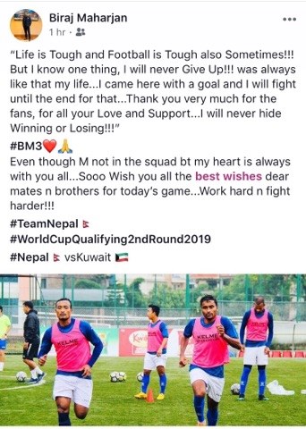 उनले फेसबुमा लेखेका छन् । ‘जीवन कठिन छ । कहिलेकाहीं फुटबल पनि कठिन हुनु गर्दछ । तर मलाई एउटा कुरा थाहा छ, म कहिले पनि हार मान्दिन,’ उनले भावना पोखेका छन्,‘ मेरो जीवनमा यस्तो बारम्बार हुनेगर्दछ । म लक्ष्यका साथ अघि बढिरहेको छु र अन्त्यसम्म संघर्ष गर्छु । माया र साथका लागि समर्थकहरु सबैलाई धन्यवाद । म जित वा हारलाई कहिल्यै लुकाउने छैन ।’