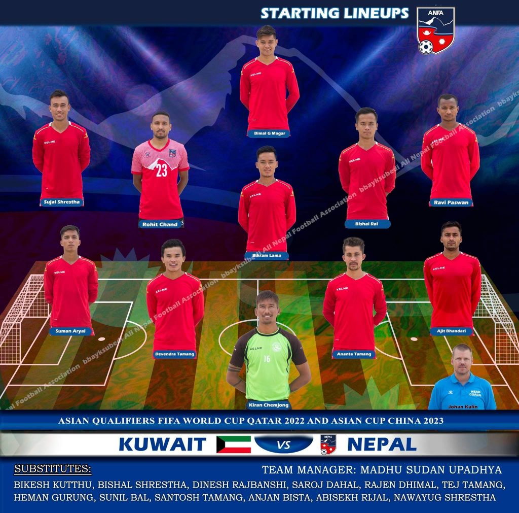 काठमाडौं (हाम्रो खेलकुद) – विश्वकप छनोट अन्तर्गत पहिलो खेलका लागि नेपालको सुरुवाती ११ घोषणा भएको छ । यसअघि हाम्रो खेलकुदडट कमले प्रस्तुत गरेको सम्भावित ११ जस्तै प्रशिक्षक कालिनले विमल घर्तीमगरलाई एकल फरवार्डका रुपमा टोली उतारेका छन् ।