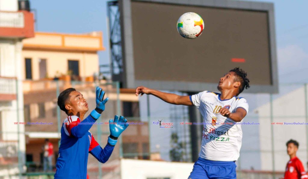 सातदाेबाटाेस्थित एन्फा कम्प्लेक्सकाे खेल मैदानमा शनिबार भएकाे खेलमा याेगेश गुरुङकाे गाेलबाट खेलमा अग्रता लिएकाे हाे । ३० अाैं मिनेटमा विशाल राईकाे फ्रिकिकमा याेगेशले गाेल गरेका हुन् । पेनाल्टीबक्सबाहिर प्राप्त फ्रिकिक क्रसबारमा लागेर फर्किएपनि पाेस्ट नजिक अनमार्क रहेका याेगेशले हेडमार्फत गाेल गर्दै अग्रता दिलाए ।