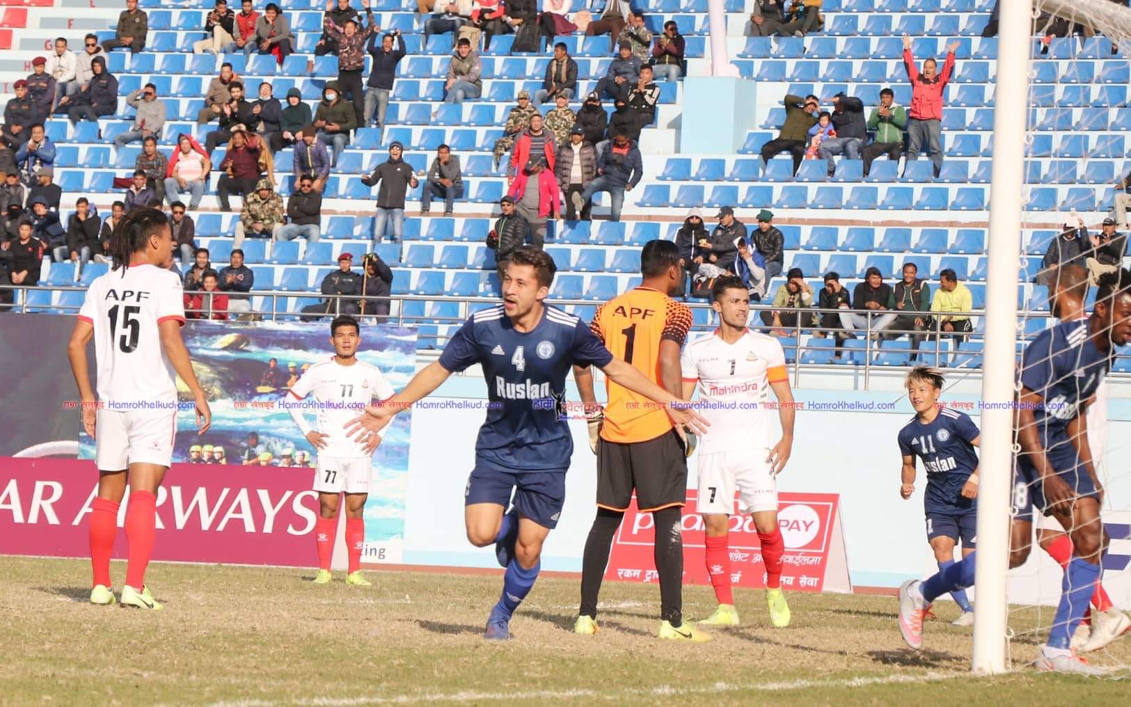 काठमाडौं (हाम्रो खेलकुद)– रुस्लान थ्री स्टार क्लबले नेपाल एपिएफ क्लबविरुद्ध कतार एयरवेज सहिद स्मारक ए डिभिजन लिगको पहिलो हाफमा १–० को अग्रता लिएको छ ।
