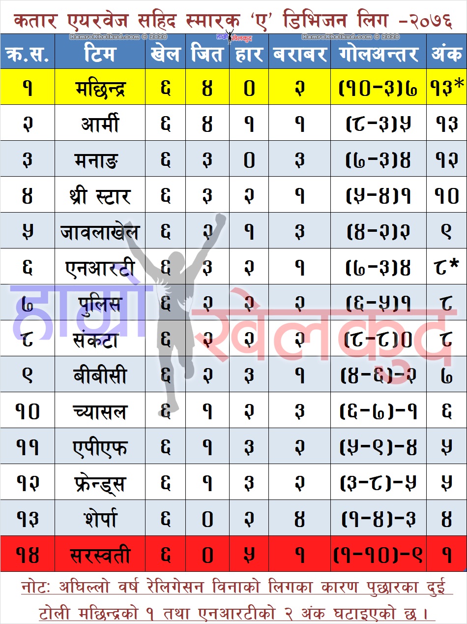 काठमाडौं (हाम्रो खेलकुद) – राजधानीमा जारी कतार एअरवेज सहिद स्मारक ए डिभिजन लिग २०७६ लगभग मध्यभागतिर आइपुगेको छ । कुल १३ चरणको खेल हुने लिगको छैटौं चरण आइपुग्दा उपाधि दावेदार मानिएका टोली नै शीर्ष ४ मा रहेका छन् ।