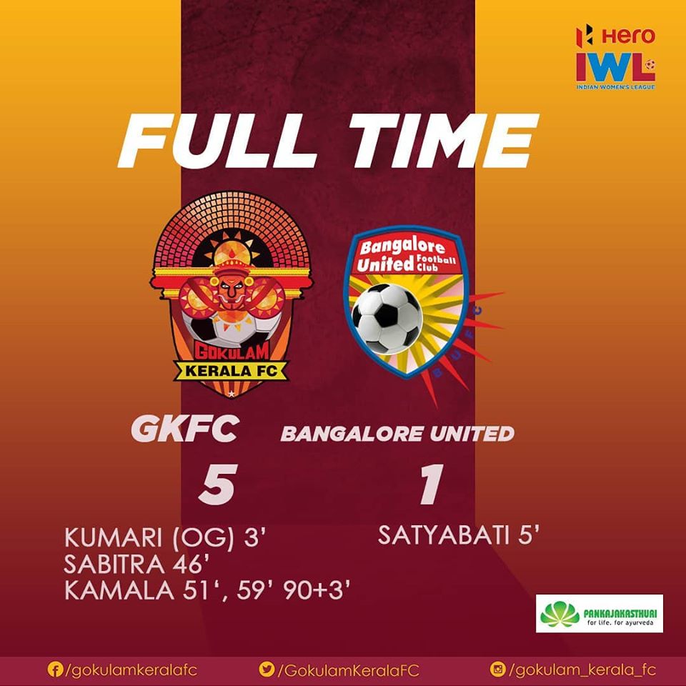 तर, त्यसको दुई मिनेट नबित्दै बैंगलोरका लागि सत्यवती काडियाले बराबरी गोल गर्दै टोलीलाई खेलमा फर्काइन् । ४६ औं मिनेटमा सावित्राको गोलबाट गोकुलमले अग्रता लिएको थियो । कमलाले ५१ औं ,५९ औं र इन्ज्युरी समयको तेस्रो मिनेटमा गोल गर्दै ह्याट्रिक पुरा गरिन् ।