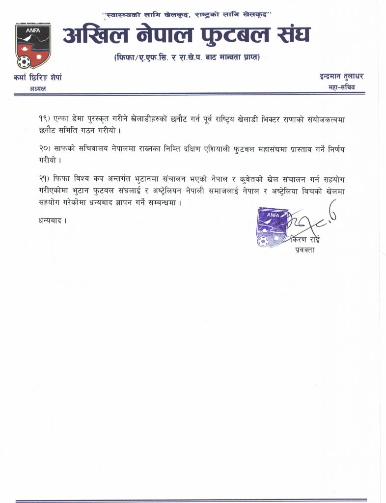 नौं महिनापछि आइतबार बसेको एन्फाको बैठकले सागको रजत पदक विजेता महिला टोलीका सदस्यलाई भने जनही १ लाख ५० हजार रुपैयाँ दिने निर्णय गरेको छ ।