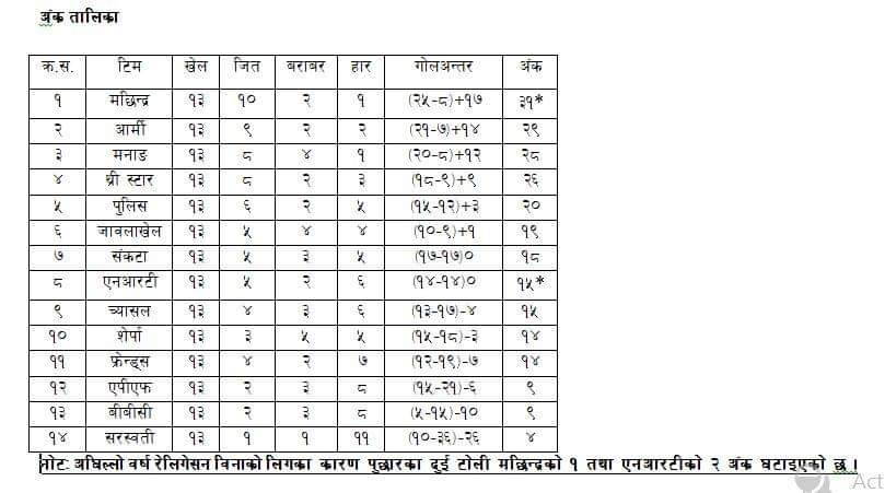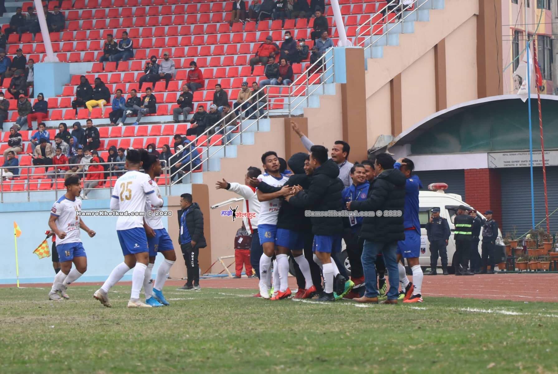 विकास तामाङको आत्मघाती गोलमा मछिन्द्र विजयी भएको हो । बराबरी गरे पुग्ने अन्तिम खेलमा पराजित भएको त्रिभुवन आर्मी क्लब फेरि लिग च्याम्पियन हुन बाट चुक्यो । १३ खेलमा मछिन्द्रले १० मा जित २ मा बराबरी र १ मा हार सहित ३१ अंक रहँदै शीर्ष स्थानमा रह्यो । आर्मी १३ खेलमा आर्मीले ९ मा जित, समान २ मा हार र बराबरी सहित २९ अंक रहँदै दोस्रो स्थानमा रह्यो ।