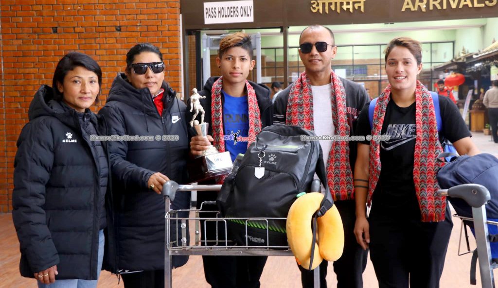 उनीहरुलाई अखिल नेपाल फुटबल संघ (एन्फा) का महिला समितिका संयोजककी पेमा डोल्मा लामा र फिफा सहायक रेफ्री विना श्रेष्ठले त्रिभुवन अन्तर्राष्ट्रिय विमानस्थलमा स्वागत गरेका थिए ।