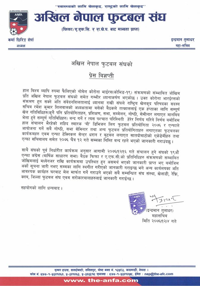 योसँगै एन्फाले चैत १६ गतेका लागि तय गरेको साधारण सभा (एन्फा कंग्रेस) पनि स्थगित भएको छ । कोरोना संक्रमणको सम्भावित जोखिमलाई ध्यानमा राख्दै विश्व फुटबल महासंघ (फिफा० र एसियाली फुटबल महासंघ (एएफसी) का प्रतिनिधिले आउन असर्थन हुने जनाएसँगै साधारण सभा स्थगित गरिएको एन्फाले जनाएको छ ।