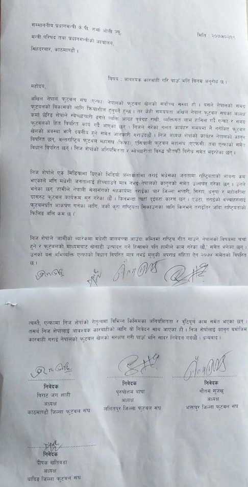 एन्फा ४ जिल्ला काठमाडौंका अध्यक्ष विराटजंग शाही, भक्तपुरका अध्यक्ष गौताम सुजखु, धादिङका अध्यक्ष दीपक खतिवडा र एन्फाबाट निलम्बित ललितपुरका अध्यक्ष पुरुषोत्तम थापाले संयुक्त रुपाम हस्ताक्षण गरेको निवेदन सोमबार मन्त्री परिषद् तथा प्रधानमन्त्री कार्यालयमा दर्ता भएको छ ।