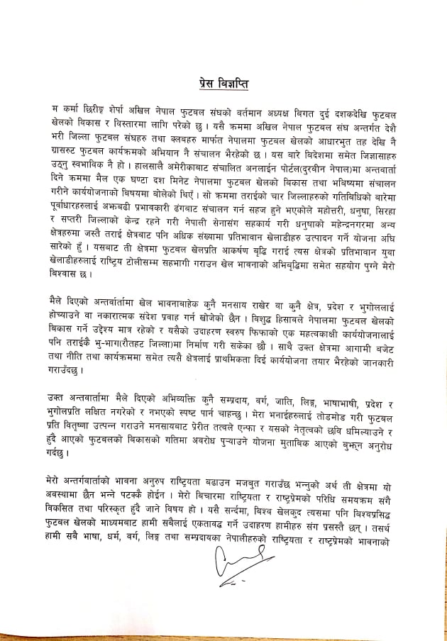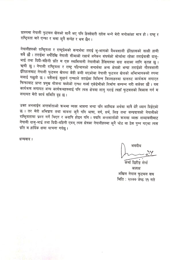 काठमाडौं (हाम्रो खेलकुद)– अखिल नेपाल फुटबल संघ (एन्फा) का अध्यक्ष कर्मा छिरिङ शेर्पाले आफ्नो विवादस्पद अभिव्यक्तिका लागि माफी मागेका छन् । झन्डै दुई साता अघि एन्फा अध्यक्ष शेर्पाले वेब पोर्टललाई दिएको अन्तवार्तामा ग्रासरुट कार्यक्रमका विषयमा बोल्ने क्रममा तराईमा राष्ट्रियताको कमी रहेको बताएपछि विवादमा परेका थिए ।