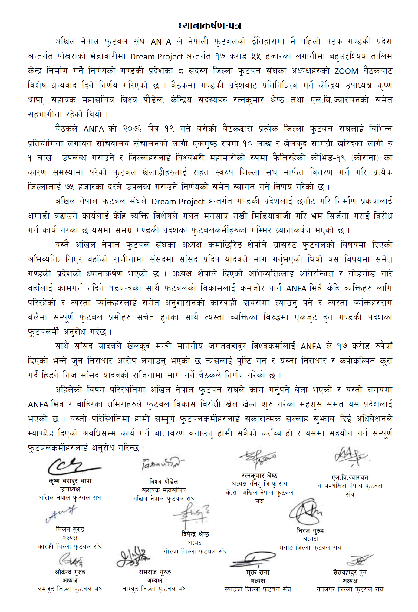 बैठकपछि केन्द्रिय समितिका प्रतिनिधिसँगै जिल्ला अध्यक्ष लोकेन्द्र गुरुङ (लमजुङ), राजराज गुरुङ (बागलुङ), मुक्त राना( स्याङजा),सेतवहादुर पुन (नवलपुर), मिलन गुरुङ (कास्की),दिपेन्द्र श्रेष्ठ (गोरखा) र निरज गुरुङ (मनाङ) ले संयुक्त रुपमा विज्ञप्ती जारी गरेका हुन् । कास्की जिल्ला फुटबल संघले निलम्बन गरेका मिलन गुरुङ अध्यक्षकै हैसियतमा मंगलबारको बैठकमा सामेल भएका थिए ।