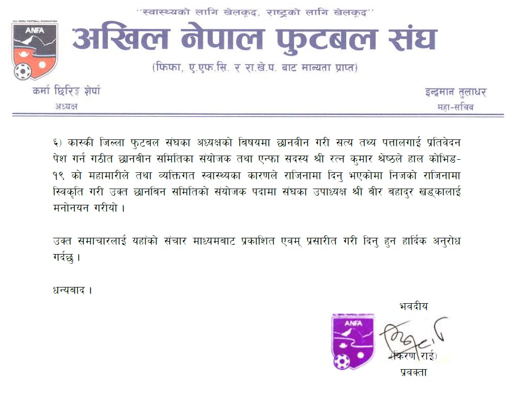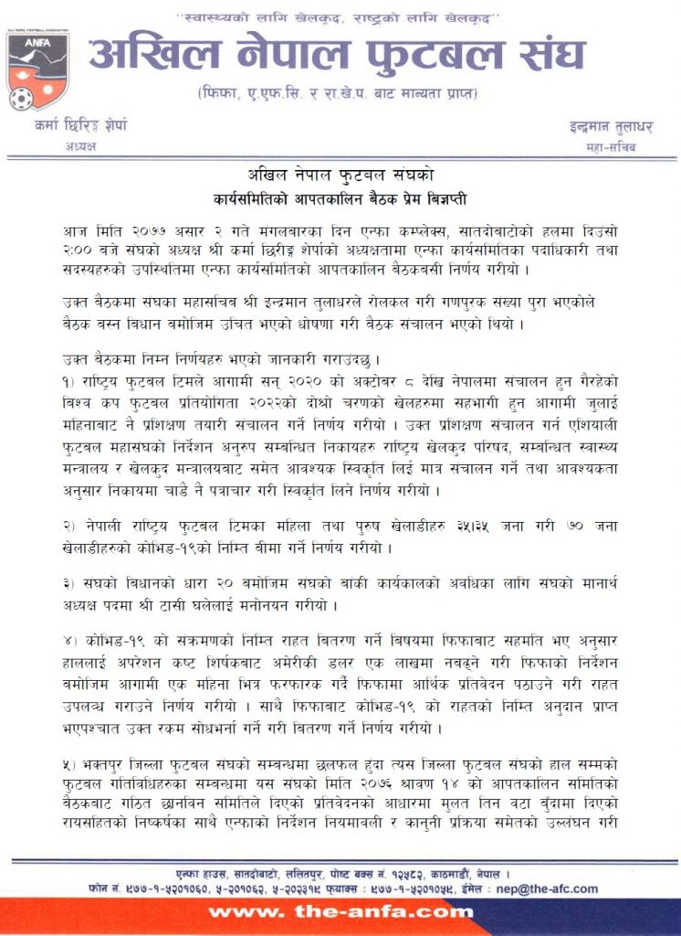 ‘प्रशिक्षण सञ्चालनका लागि एसियाली फुटबल महासंघ (एएफसी) को निर्देशन अनरुप सम्बधित निकायहरु राष्ट्रिय खेलकुद परिषद् (राखेप), स्वास्थ्य मन्त्रालय, खेलकुद मन्त्रालयबाट समेत आवश्यक स्वीकति लिइन मात्र सञ्चालन गर्ने तथा आवश्यकता अनुसार निकायमा चाडै पत्राचार गरि स्वीकृति लिने निर्णय गरियो ,’ एन्फाले जारी गरेको विज्ञप्तीमा भनिएको छ ।