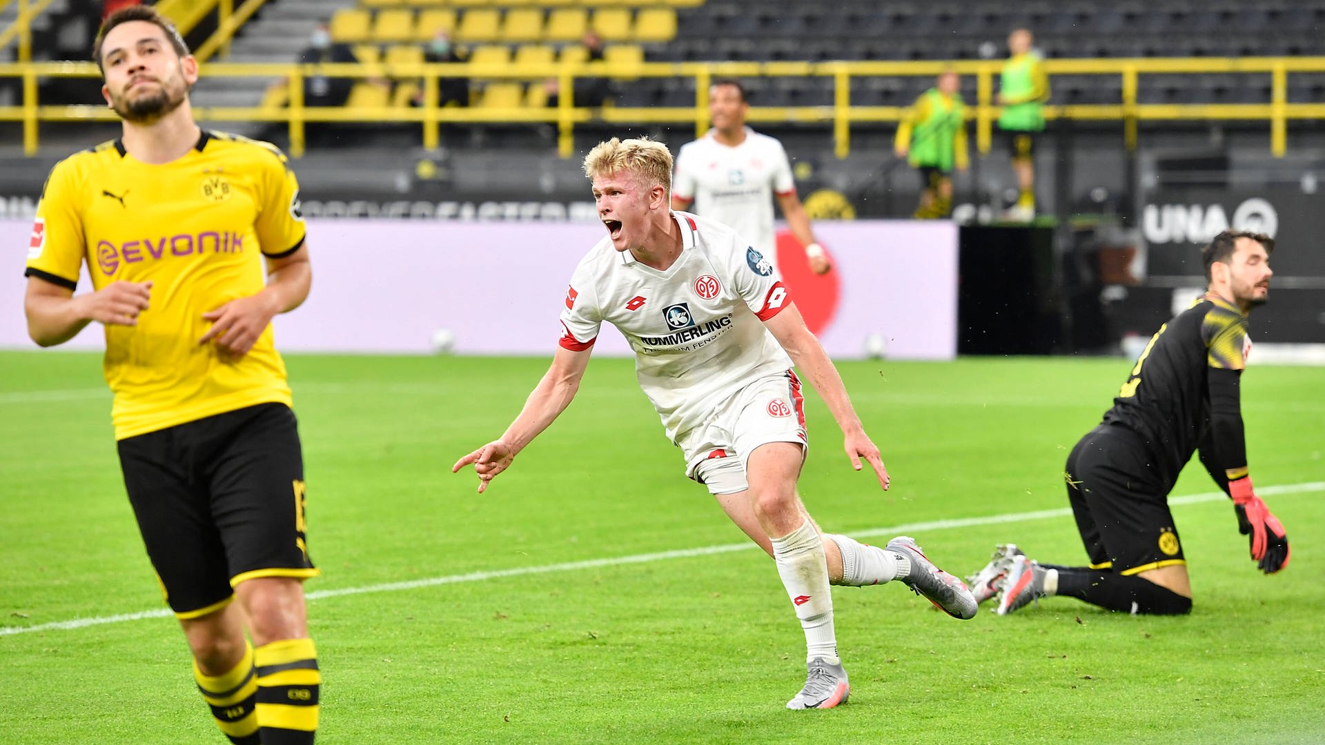 सिग्नल इडुना पार्कमा बुधबार राति भएको खेलमा डर्टमुन्डसँग दवावमा खेलिरहेको माइन्जले काउन्टर एट्याकमा केही आक्रमण बुन्ने प्रयास गरिरहेको थियो । ३३औं मिनेटमा बोटे बाकुको उत्कृष्ट क्रसमा जोनाथनले गोल गर्दै घरेलु टोलीविरुद्ध माइन्जलाई अग्रता दिलाए । ३६औं मिनेटमा डर्टमुन्डले बराबरीको अवसर गुमायो । कर्नरमा माइन्जका लाट्जाको हेडरलाई आफ्नै गोलरक्षक फ्लोरियन मुलरले बचाए ।