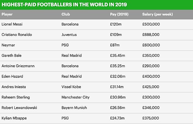 रोनाल्डोले १०९ मिलियन पाउन्ड कमाएका छन् । मेस्सीले रोनाल्डोको भन्दा ११ मिलियन बढी कमाए । १०० मिलियनभन्दा बढी कमाई गर्ने खेलाडी मेस्सी र रोनाल्डोमात्रै रहेका छन् । उनीहरुले आफ्नो पारिश्रमिक, बोनस, विज्ञापन लगायत अन्य माध्यमबाट कमाई गरेका हुन् ।