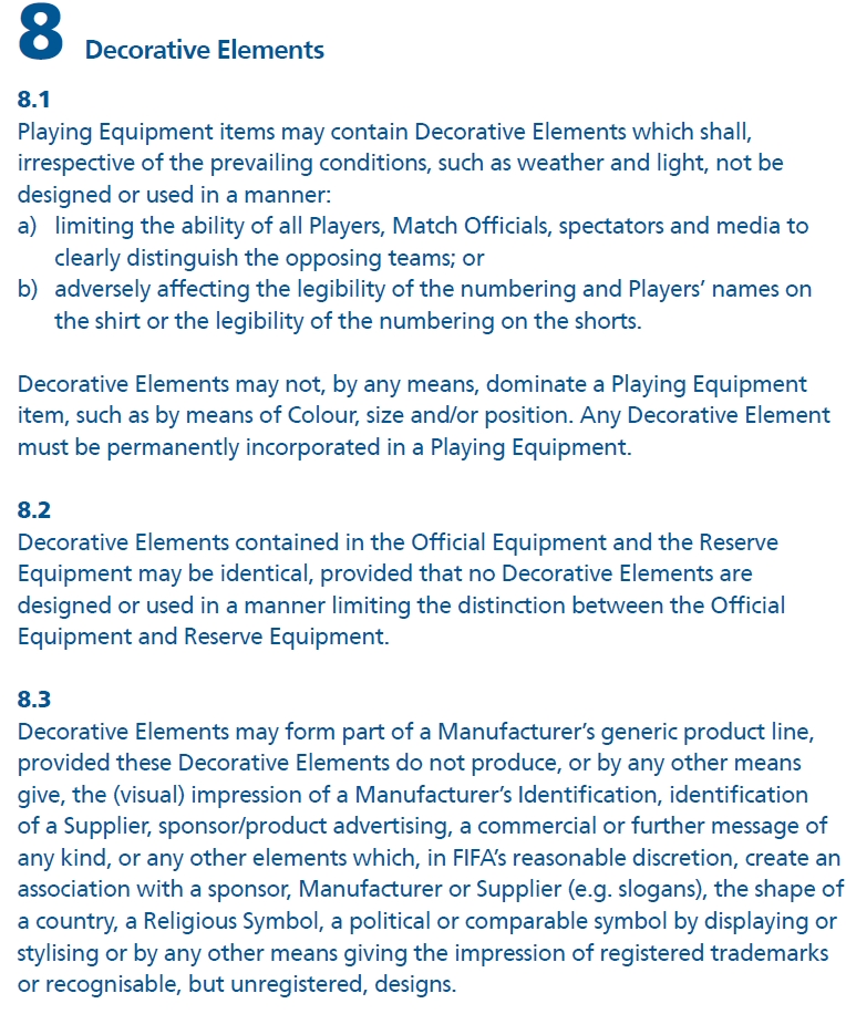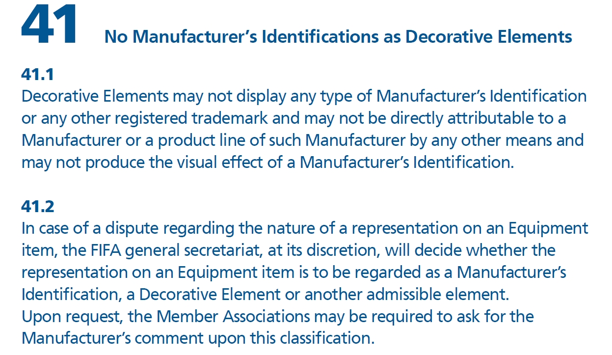 फिफाको फिफाको खेल सामग्री नियमावलीको दोस्रो सेक्सनको ८.३ नियममा जर्सीमा सिंगारका रुपमा प्रयोग हुने डिजाइनले जर्सी निर्माताको परिचय, विज्ञापन, कुनै किसिमको सन्देश अथवा कुनै देश, धर्म, राजिनिती वा कुनै आकृति राखेर प्रस्तुत गर्न पाइन्न भन्ने उल्लेख गरिएको छ । यस्तै छैटौं सेक्सनको नियम नम्बर ४१ मा पनि कुनै निर्माता कम्पनिले कुनै पनि डिजाइनमार्फत आफ्नो विज्ञापन गर्न नपाइने उल्लेख छ ।