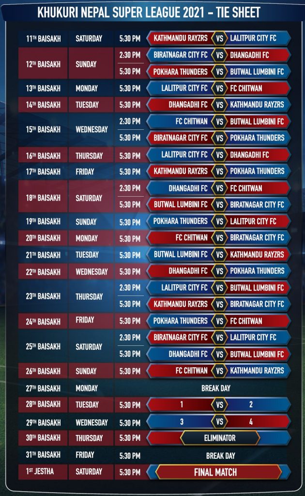 पहिलो खेल वैशाख ११ गते साँझ ५ः३० बजे सुरु हुनेछ । त्यस्तै दोस्रो दिन वैशाख १२ गते दुई खेल हुनेछन् । दिउँसो २ः३० बजे सुरु हुने खेलमा विराटनगर सिटी एफसी र धनगढी एफसीबीच खेल हुनेछ । सोही दिन साँझ ५:३० बजे पोखरा थन्डर्स र बुटवल एफसीबीच प्रतिस्पर्धा हुने भएको छ । यसअघि वैशाख ११ देखि २५ गते सम्म एनएसएल हुने भनिएपनि नयाँ तालिका अनुसार जेठ १ गते समापन हुनेछ ।