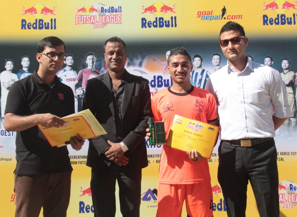 शंखमुल फुटसलका सुरज महर्जनलाई म्यान अफ द म्याचको पुरस्कार प्रदान गर्दै आयोजक एएमए इभेन्टका पदाधिकारी