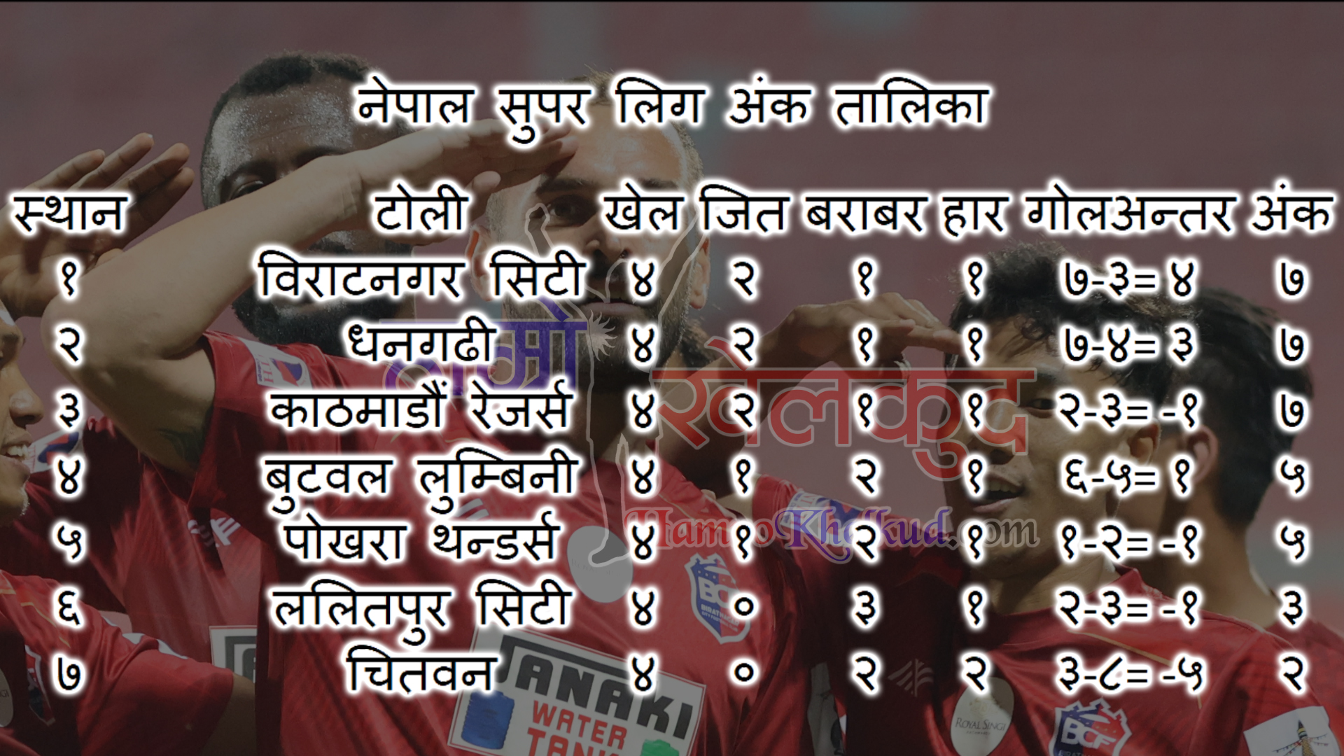 समान ७ अंक रहँदा विराटनगर सिटी एफसी शीर्ष, धनगढी दोस्रो र काठमाडौं रेजर्स तेस्रो स्थानमा रहेको छ । समान ५ अंक रहेपनि बुटवल लुम्विनी चौथो तथा पोखरा पाँचौ स्थानमा रहेको छ । ललितपुर ३ अंक जोडेर छैटौ तथा चितवन २ अंक जोडेर पुछारमा छ ।