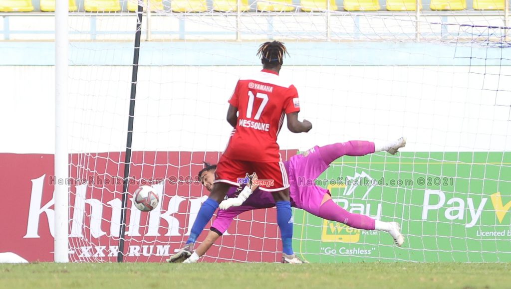 १४औं मिनेटमा मेसौके ओलुमोउले गोल गर्दै काठमाडौंलाई १–० को अग्रता दिलाएका हुन् । कमल श्रेष्ठले पेनाल्टी बक्समा मेसौके ओलुमोउलाई लडाएपछि रेफ्री प्रज्वल क्षेत्रीले काठमाडौंलाई पेनाल्टी प्रदान गरेको थियो । जसमा उनी चुकेनन् । गोलरक्षक अर्पण कार्कीले सही दिशामा डाइभ दिएपनि बचाउन सकेनन् ।