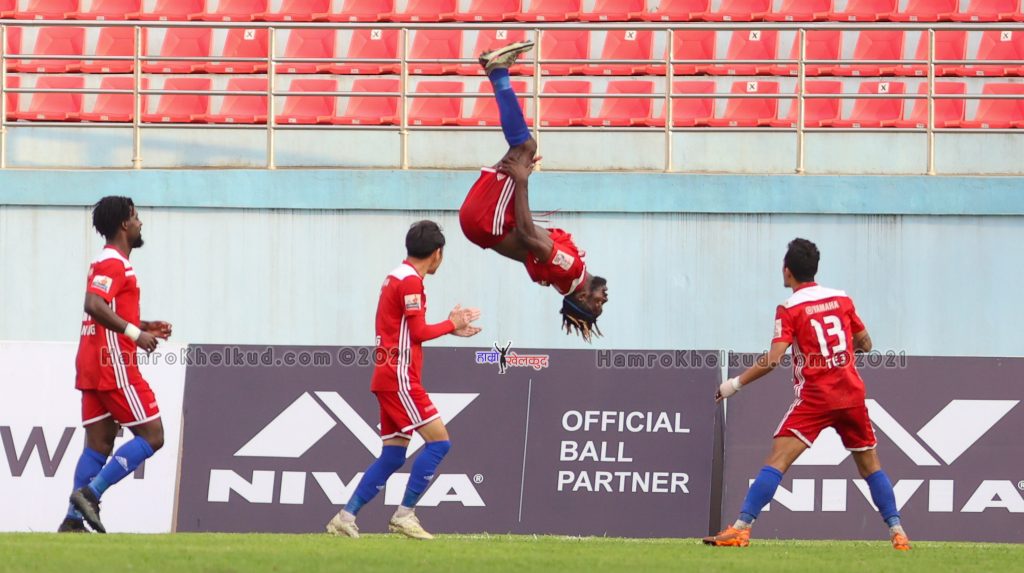 त्रिपुरेश्वरस्थित दशरथ रंगशालामा बिहीबार भएको खेलमा मेसौके ओलुमोउको दुई गोल मद्दतमा काठमाडौंले पहिलो हाफमा ललितपुरविरुद्ध २–० को अग्रता लिएको हो ।