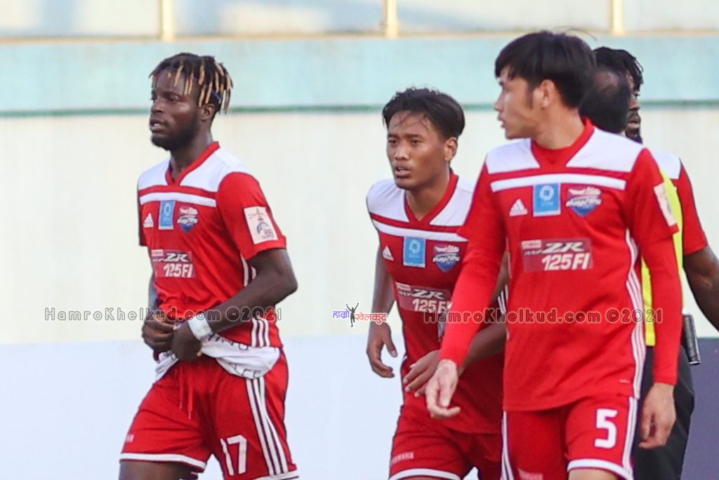 प्रतिस्पर्धात्मक बनेको खेलको २१औं मिनेटमा मेसौके ओलुमोउले गोल गर्दै काठमाडौं रेजर्सलाई १–० को अग्रता दिलाए । विशाल राईबाट बल खोस्दै विश्वास श्रेष्ठले दिएको पासमा मेसौके ओलुमोउले उत्कृष्ट फिनिस गर्दै काठमाडौंलाई अग्रता दिलाए । २१ मिनेटसम्मको पहिलो मुभमा नै काठमाडौंले गोल गर्न सफल भएका हुन् ।