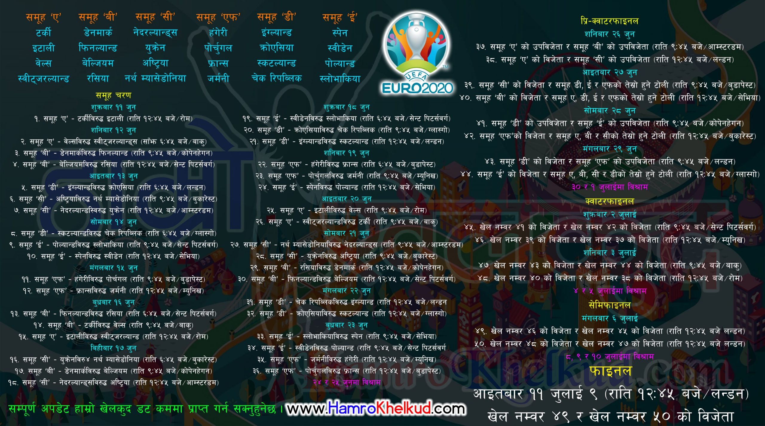 ४३. समूह ‘डी’ को विजेता र समूह ‘एफ’ को उपविजेता (राति ९:४५ बजे/लन्डन)