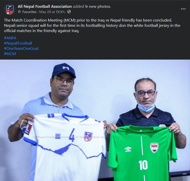 इराकसँग शनिबार मैत्रीपूर्ण खेलको अघिल्लो दिन व्यवस्थापकको बैठकमा टोली सेतो रंगको जर्सी प्रयोग गरिने भन्दै सार्वजनिक गर्यो । त्यसको केहि समयमा एन्फाले आफ्नो आधिकारिक फेसबुक पेजबाट राष्ट्रिय टोलीले पहिलो पटक सेतो जर्सी पहिलो पटक प्रयोग गर्न लागेको भन्दो फोटो सर्वजनिक गर्यो । एन्फा अध्यक्ष कर्मा छिरिङ शेर्पाले पनि राष्ट्रिय टोली पहिलो पटक सेतो जर्सी प्रयोग गर्न लागेको भन्दै ट्विट गरेका थिए ।