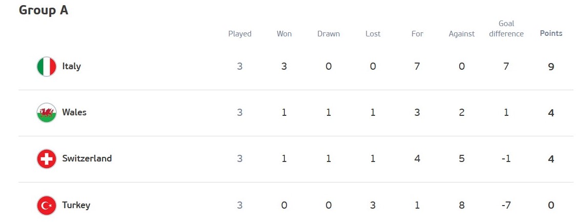 वेल्समाथि जित हासिल गरेको इटाली समूहको अन्तिम चरणको खेल समाप्त भएसँगै ३ खेलमा ९ अंक जोड्दै शीर्षस्थानमा रहयो । वेल्स र स्विट्जरल्यान्डको समान ४-४ अंक भएपनि गोलअन्तरको आधारमा वेल्स दोस्रो स्थानमा रहँदै अन्तिम १६ मा प्रवेश गर्यो । यसअघि वेल्स र स्विट्जरल्यान्डको खेल १-१ को बराबरीमा सकिएको कारण गोलअन्तरले नै समूहमा स्थानको छिनोफानो भएको हो ।