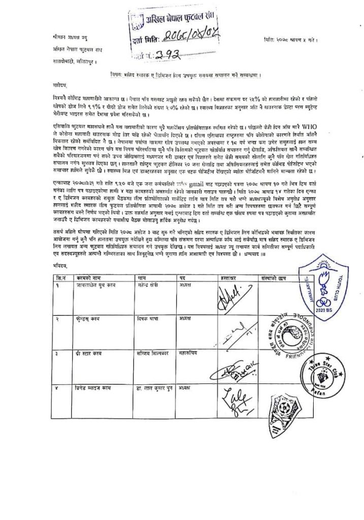 कोभिडको भयावह स्थितिमा पनि ए डिभिजन लिग आयोजना गर्न कुनैपनि हालमा उपयुक्त नभएको ठहर गर्दै ४ क्लबले संक्रमण दरमा अत्याधिक कमि आइसकेपछि मात्र लिगलगायत फुटबल गतिविधि गर्न उपयुक्त हुने सुझाव दिएका छन् । साथै उनीहरुले एन्फा अध्यक्ष, पदाधिकारी, सदस्यलाई यो विषयलाई गम्भिरतापूर्वक लिन आग्रह समेत गरेका छन् ।