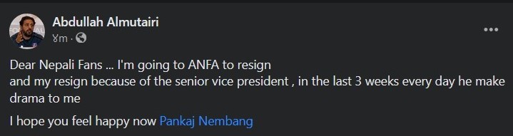 असार १० गते घटनाले नयाँ मोड लियो । अलमुताइरीले सामाजिक सञ्जाल फेसबुकमार्फत समर्थकलाई सम्बोधन गरेर राजीनामा दिने घोषणा गरे । उनले घोषणा मात्र गरेनन् एन्फाका वरिष्ठ उपाध्यक्ष नेम्बाङमाथि गम्भिर आरोप पनि लगाए । नेपाली फुटबलमा विदेशी प्रशिक्षकले सर्वजनिक रुपमै एन्फा पदाधिकारीको बारेमा लेखेको यो नै पहिलो घटना हो ।