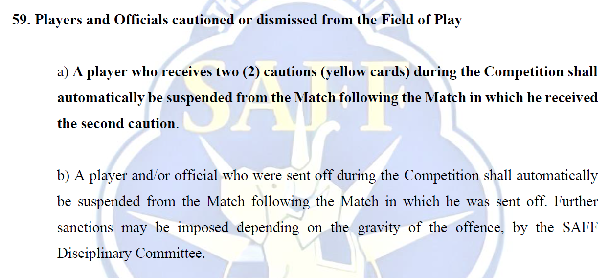 त्यसो त एएफसीको अनुशासन नियमावलीले कुनैपनि व्यक्तिले एक प्रतियोगिताको दुई खेलमा पहेंलो कार्ड पाउँछ भने अर्को खेल गुमाउने लेखेको छ । तर उक्त नियमावलीमा प्रतियोगिताको आफ्नै नियम छ भने त्यसमा परिवर्तन गर्न सकिने उल्लेख छ । साफको नियमावलीमा भने अफिसियललाई दुई फरक खेलको पहेंलो कार्डमा प्रतिबन्ध लाग्ने उल्लेख गरिएको छैन । अलमुताइरीले लिग चरणमा श्रीलंका र अन्तिम खेलमा बंगलादेशविरुद्ध पहेंलो कार्ड पाएका थिए ।