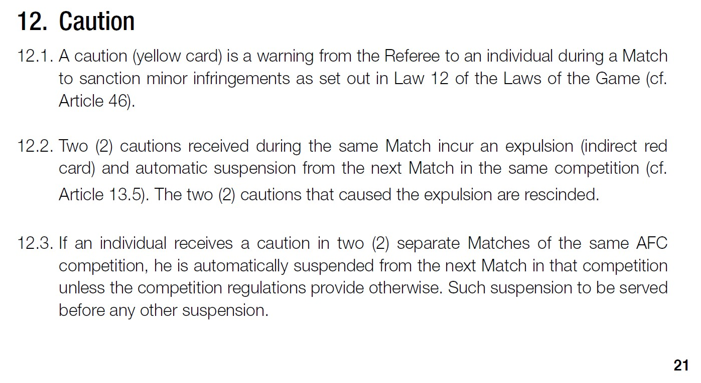 ५९ (क) – कुनैपनि खेलाडीले प्रतियोगिता दौरान दुई पहेंलो कार्ड पाउँछ भने दोस्रो कार्ड पाएको खेलपछि हुने खेलबाट प्रतिबन्ध भोग्नु पर्नेछ ।