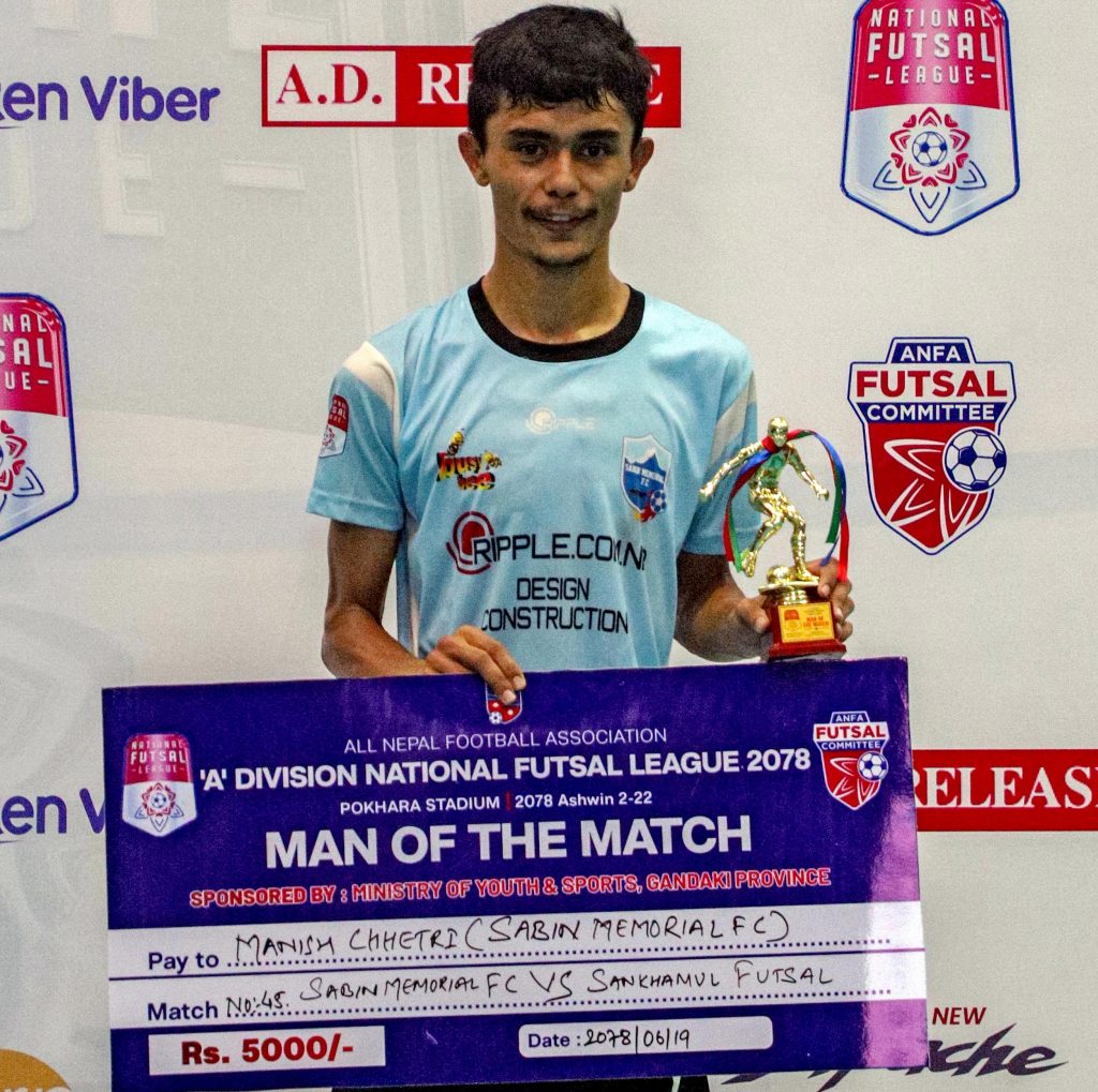 सविन मेमोरियलका लागि ५ नम्बर जर्सीमा पातलो ज्यान लिँदै विपक्षी छक्याउने खेलाडी हुन् मनिष । आर्टिफिसियल मैदानमा खेल्दा त बल्ल बच्चाको साइजको जुत्ता लगाएर खेल्ने उनले अधिकारिक फुटसल कोर्टमा खेल्दा आफ्नो साइजको जुत्ता नै पाएनन् । तरपनि उनले केहि ठूलो जुत्ता लगाएरै खेलिरहे ।