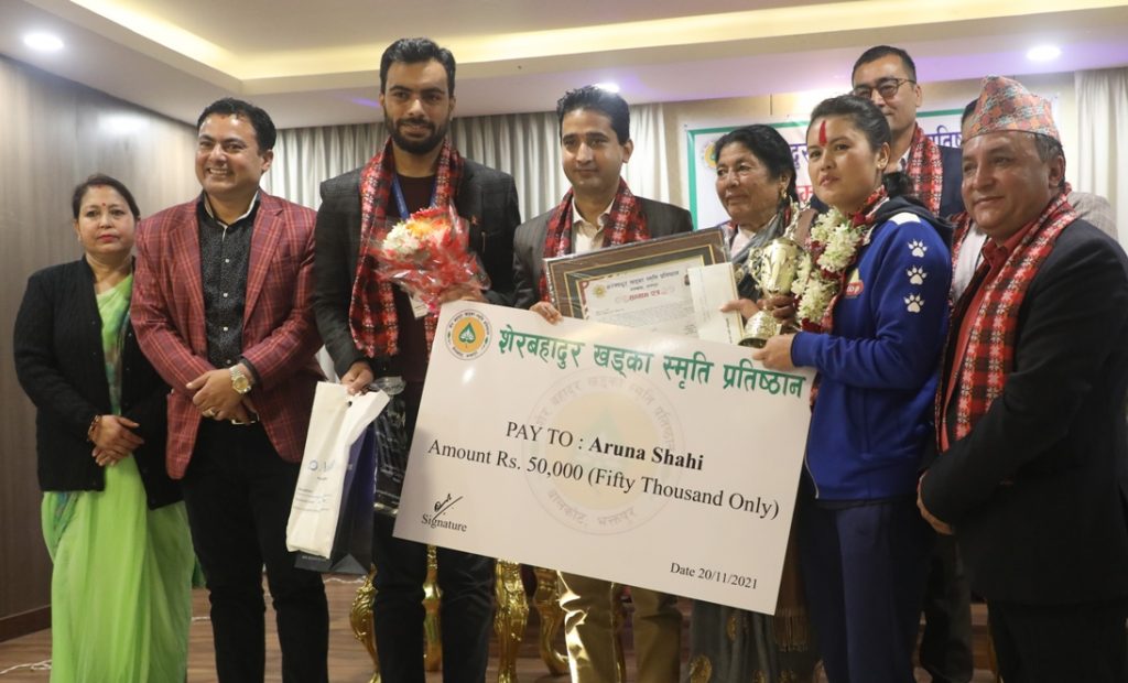 काठमाडौं (हाम्रो खेलकुद) – शेरबहादुर खड्का स्मृति प्रतिष्ठानले नेपाली राष्ट्रिय महिला भलिबल टोलीकी कप्तान अरुणा शाहीलाई शेरबहादुर खड्का स्पेसल अवार्ड– २०७७ बाट शनिबार सम्मान गरेको छ ।
