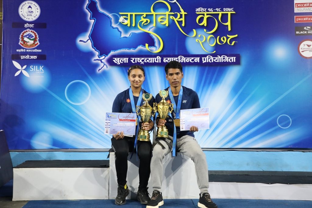 सिल्क ग्रुपको प्रायोजन, बाह्रबिसे नगरपालिकाको सहयोग तथा खुर्सानीबारी खेलकुद कभर्डहलको आयोजनामा भएको प्रतियोगिताको पुरुष युगल तर्फ सेनाका पविन लिनथेप र सुरोज महर्जनको जोडीले बुटवलका सुशिल गिरी र बिवेक न्यौपानको जोडीलाई २१–१० र २१–१५ ले पराजित गर्दै फाईनल यात्रा तय गरेका थिए ।