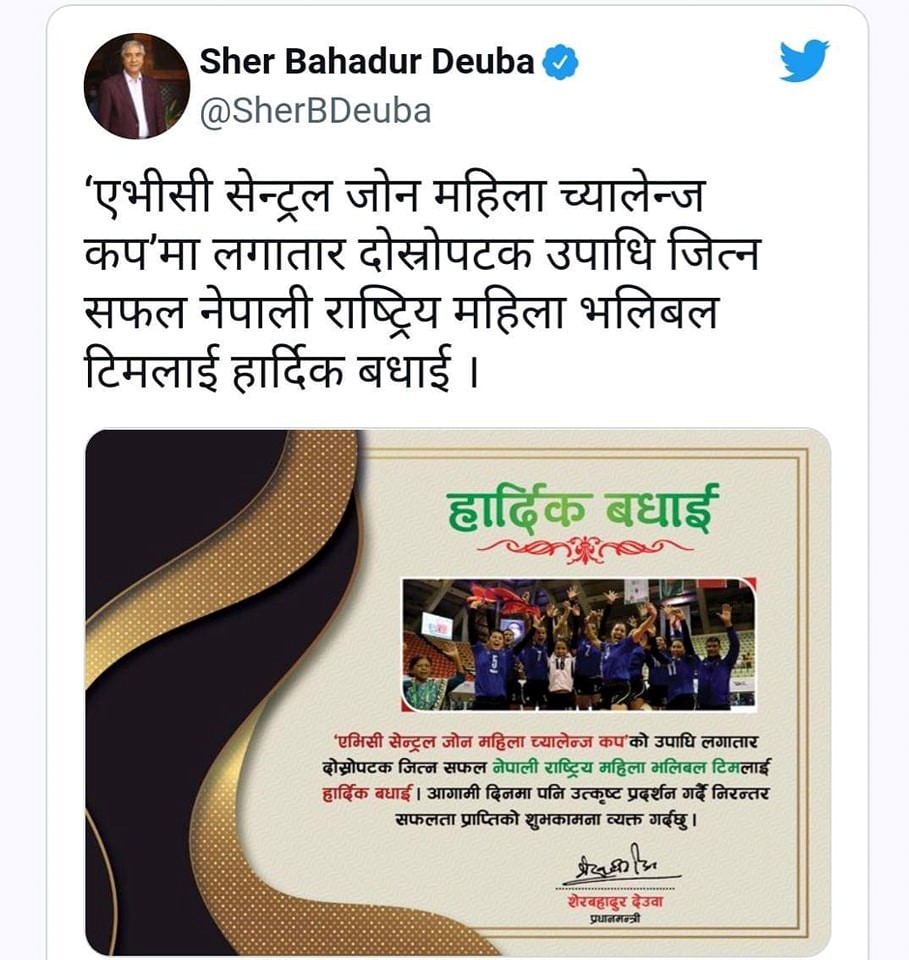 प्रधानमन्त्री देउवाले सामाजिक सन्जाल ट्वीटरबाट नेपाली टोलीलाई बधाई तथा थप सफलताको शुभकामना प्रदान गरेका हुन् । उनले ‘एभीसी सेन्ट्रल जोन महिला च्यालेन्ज कप’ मा लगातार दोस्रोपटक उपाधि जित्न सफल नेपाली राष्ट्रिय महिला भलिबल टिमलाई हार्दिक बधाई ।’ भन्दै ट्वीट गरेका छन् ।