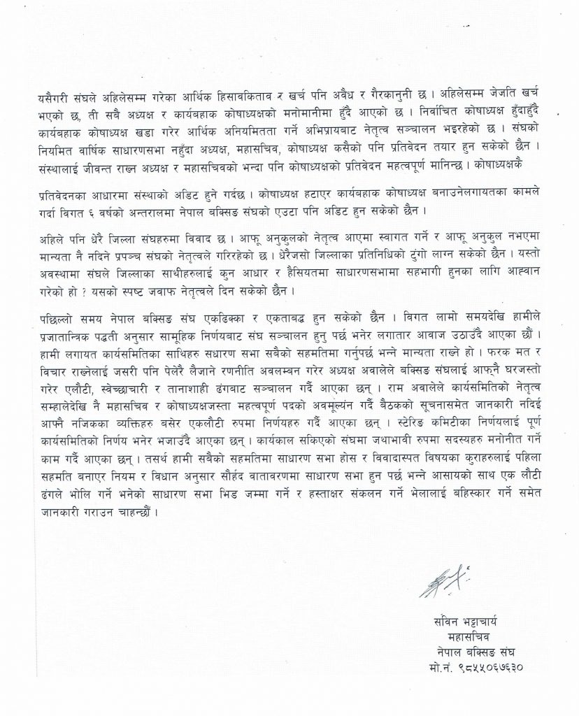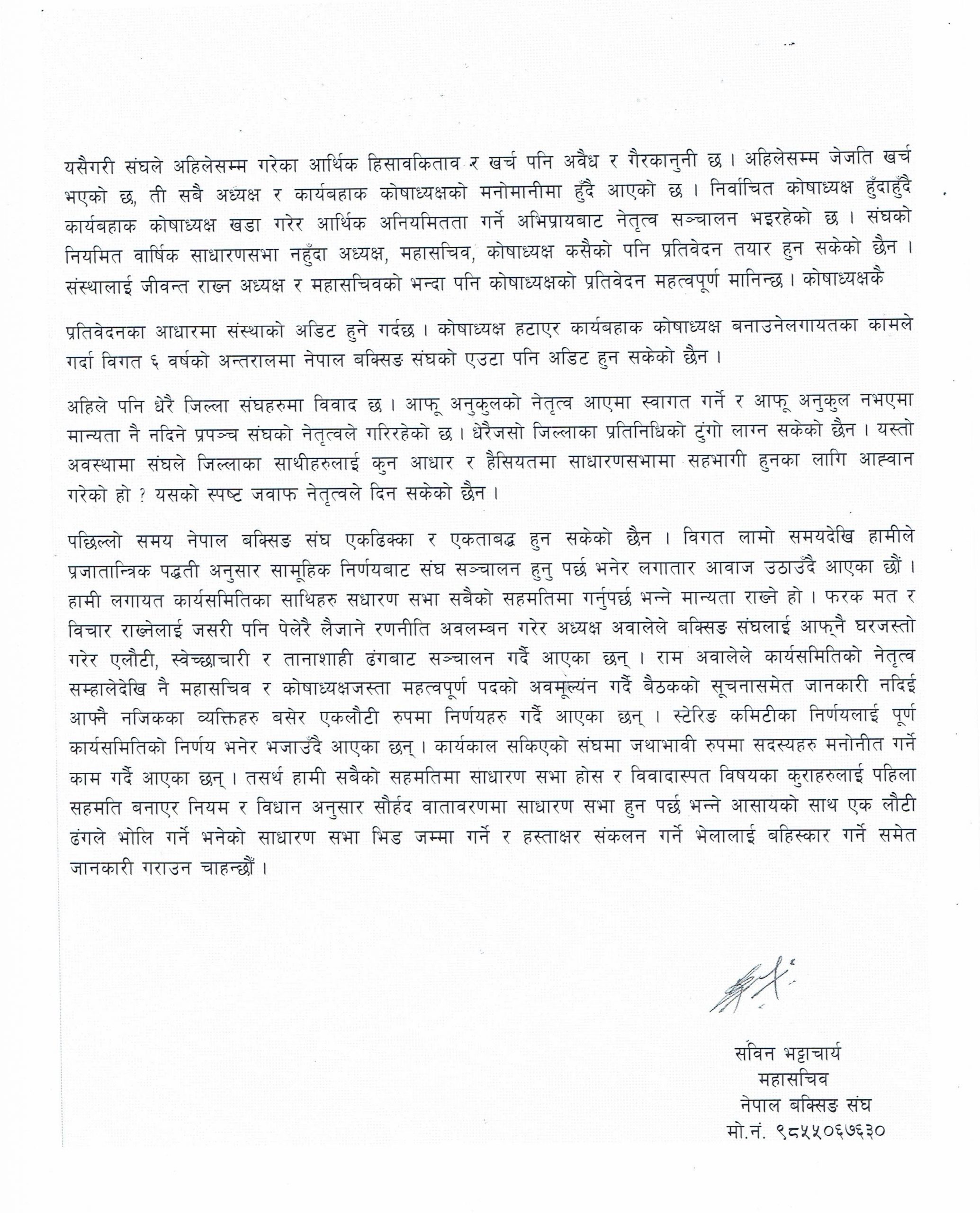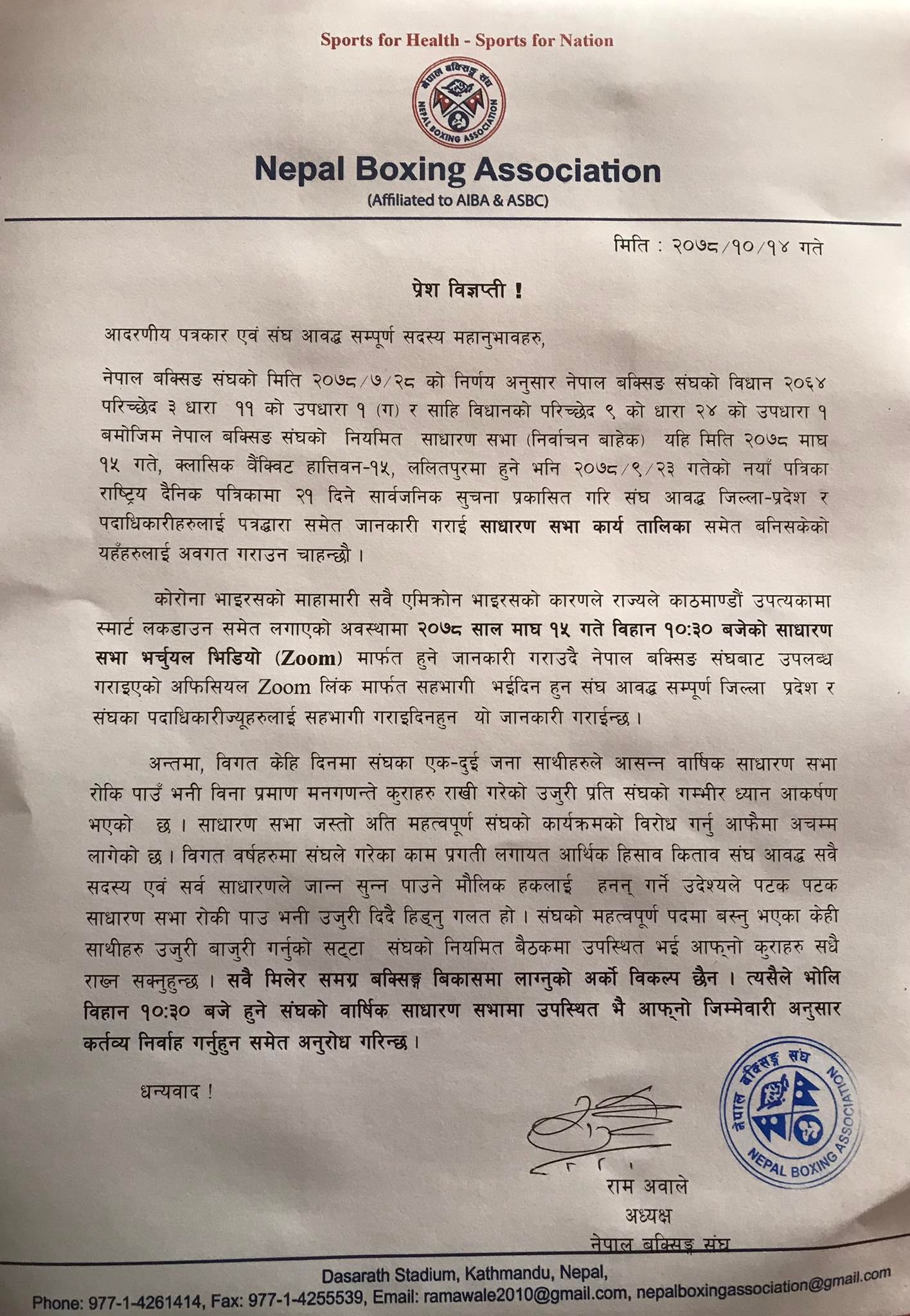 कार्यसमितिका बहुसंख्यक पदाधिकारीलाई बाइपास गरेर नेपाल सरकार र राखेपको निर्देशनको पनि बर्खिलाप हुने गरी आयोजना गर्न लागेको सो साधारणसभा रोक्नका लागि युवा तथा खेलकुद मन्त्रालय, राखेपमा लिखित रुपमा निवेदन दिए पनि सुनुवाई नभएको महासचिवले विज्ञप्तीमा उल्लेख गरेका छन् ।