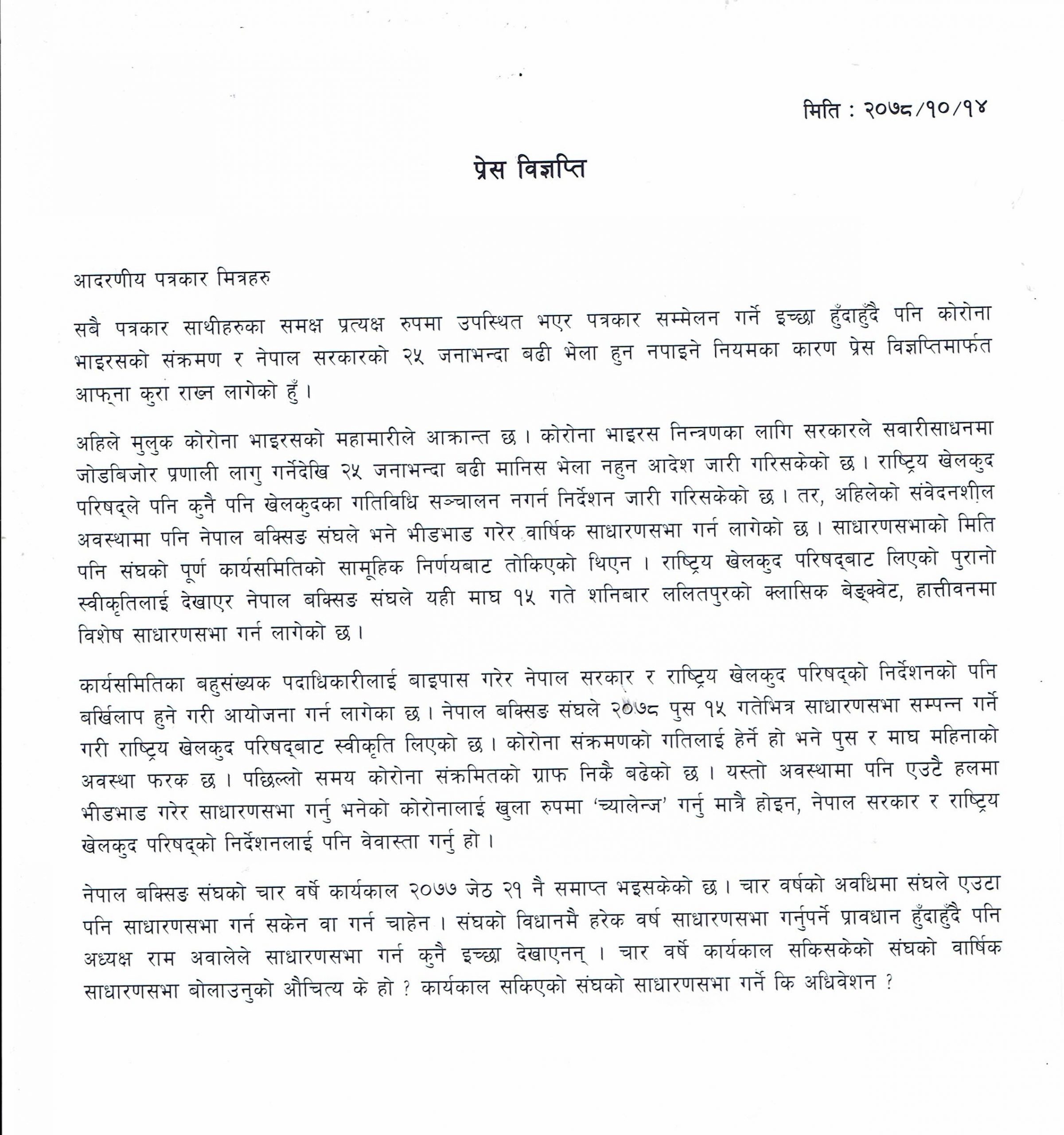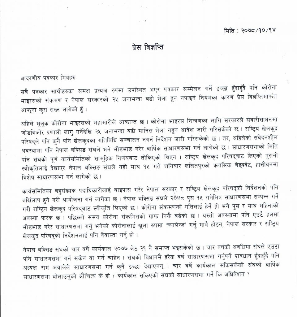 महासचिव भट्टाचार्यले शुक्रबारने अर्को विज्ञप्ती जारी गर्दै राष्ट्रिय खेलकुद परिषद् (राखेप) ले पनि कुनै पनि खेलकुदका गतिविधि सञ्चालन नगर्न निर्देशन जारी गरेको अवस्थामा संघले भने भीडभाड गरेर वार्षिक साधारणसभा गर्न लागेको जनाएका छन् । उनले साधारणसभाको मिति पनि संघको पूर्ण कार्यसमितिको सामूहिक निर्णयबाट नतोकिएको भन्दै राखेपबाट लिएको पुरानो स्वीकृतिलाई देखाएर संघले शनिबार साधारणसभा गर्न लागेको उल्लेख गरेका छन् ।